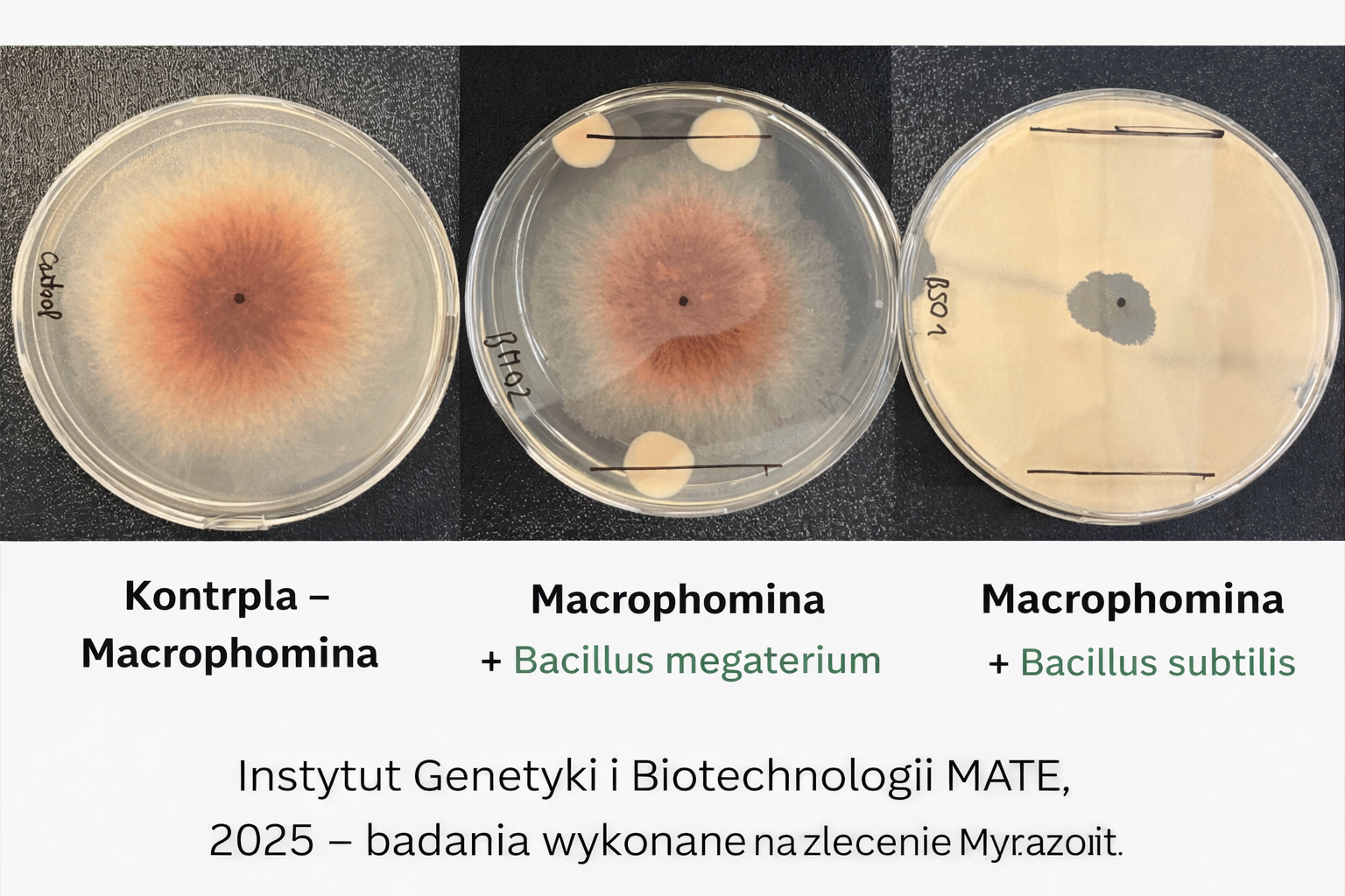Podczas badań laboratoryjnych przeprowadzono doświadczenia w płytkach Petriego, analizując wpływ różnych szczepów bakterii na rozwój patogenicznych grzybów.